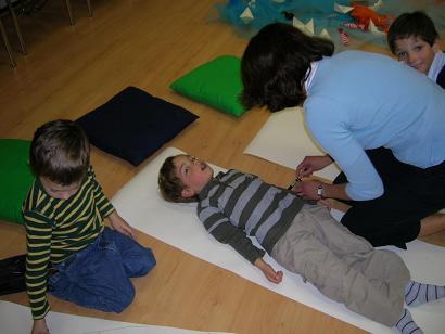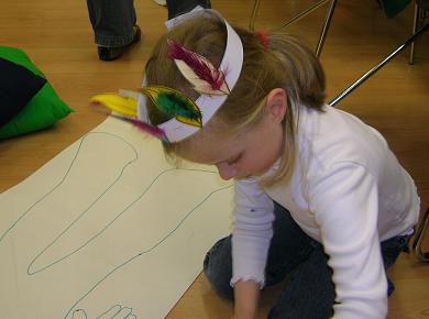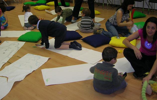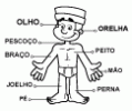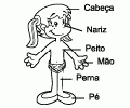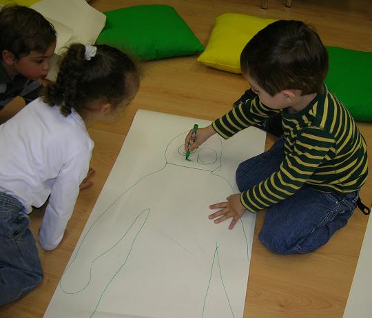 As crianças completaram o desenho, fazendo os olhos, nariz, boca, umbigo, etc.